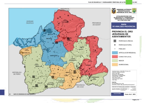 PLAN DE DESARROLLO Y ORDENAMIENTO TERRITORIAL DE LA PROVINCIA DE EL ORO PLAN DE DESARROLLO Y ORDENAMIENTO TERRITORIAL DE LA PROVINCIA DE EL ORO 20. MAPA DE JERARQUIA DE ASENTAMIENTOS. Pagina 141