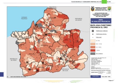 PLAN DE DESARROLLO Y ORDENAMIENTO TERRITORIAL DE LA PROVINCIA DE EL ORO PLAN DE DESARROLLO Y ORDENAMIENTO TERRITORIAL DE LA PROVINCIA DE EL ORO 10. MAPA ANALFABETISMO PROVINCIAL. Pagina 67